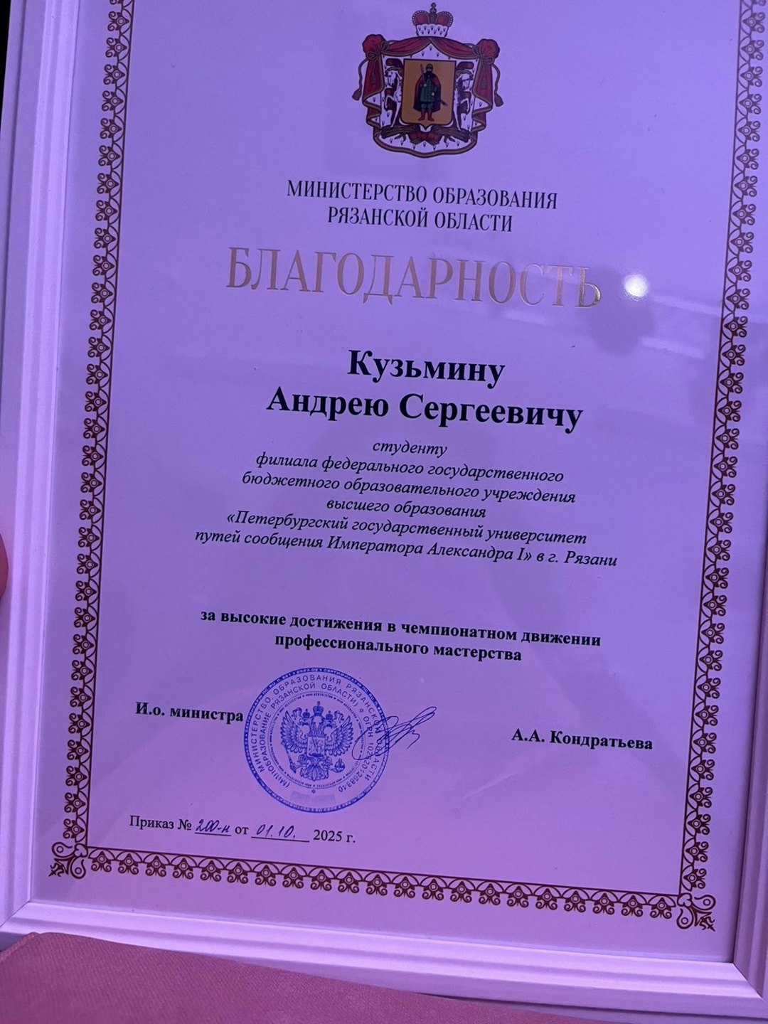 Студент группы ЭТ-411 Андрей Кузьмин, серебряный призер итогового (межрегионального) этапа Чемпионата профессионального мастерства «Профессионалы» 2025 по компетенции: «Управление моторвагонным подвижным составом», получил благодарность министерства образования Рязанской области за высокие достижения в чемпионатном движении профессионального мастерства.