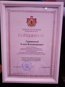Елена Владимировна Гришкова Благодарность министерства образования Рязанской области за многолетний добросовестный труд, большой личный вклад в развитие региональной системы образования;