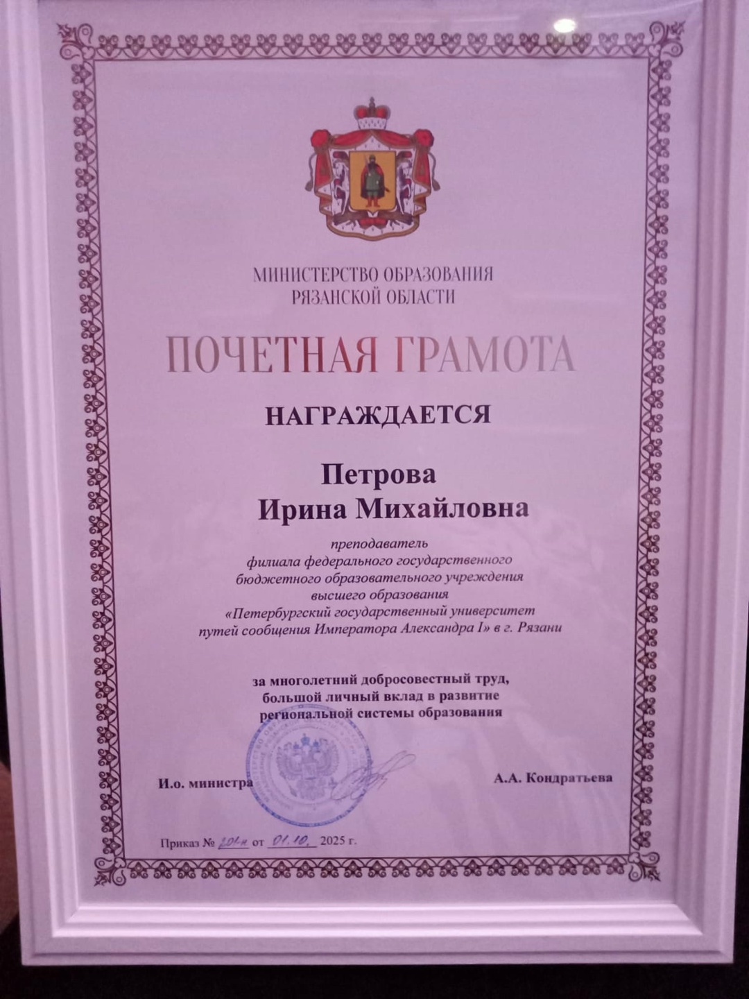 Ирина Михайловна Петрова – Почетная грамота министерства образования Рязанской области за многолетний добросовестный труд, большой личный вклад в развитие региональной системы образования;