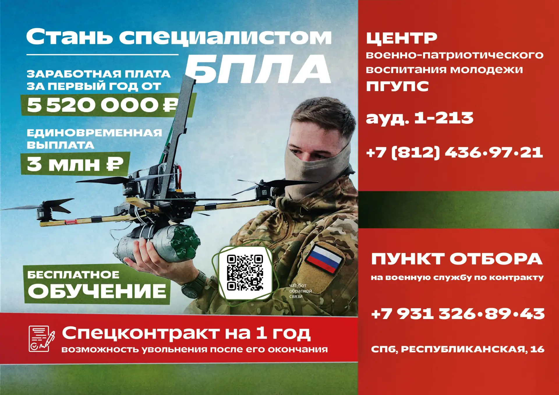 Всего за один год службы по контракту вы сможете стать квалифицированным оператором БПЛА или инженером-техником, а после — успешно построить карьеру в гражданской сфере.