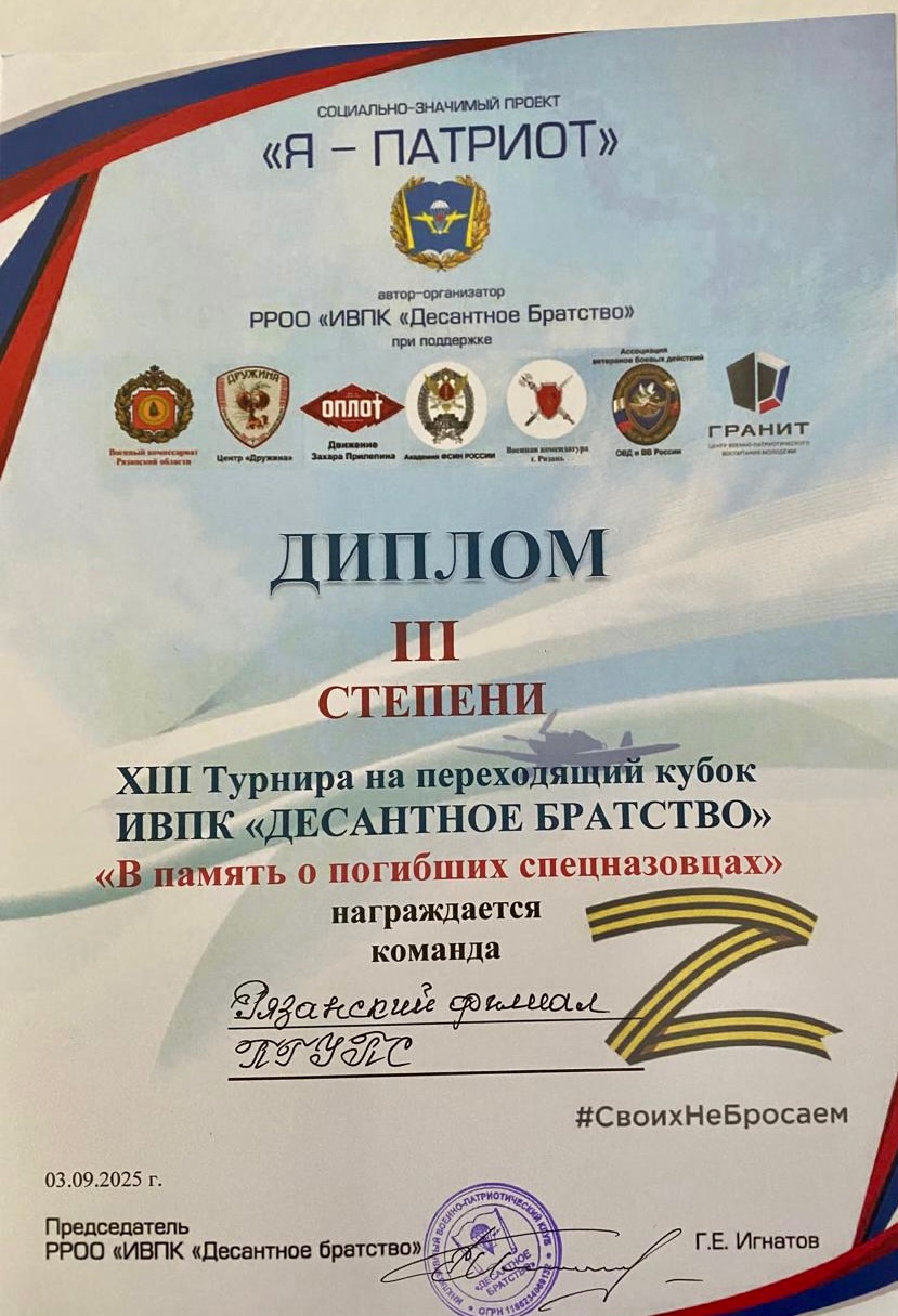 Команда Рязанского филиала ПГУПС приняла участие в XIII Турнире на переходящий кубок РРОО «ИВПК «Десантное Братство» «В память о погибших спецназовцах», который традиционно проводится в Рязани, и приурочен к памятному дню борьбы с терроризмом, в рамках проекта «Я-ПАТРИОТ», на стадионе РГАТУ им. П.А.Костычева.
