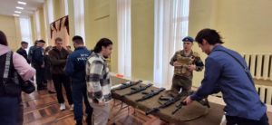 Перед открытием праздничного мероприятия, в холле ДК, И.о старшины Инклюзивного ВПК «Десантное братство» Данила Незванов, заместитель старшины Инклюзивного ВПК «Десантное братство» студент РАТ им. С.А.Живаго Ростислав Плахонин, помощники председателя Совета РРОО «ИВПК» Десантное Братство» Евгений Ваничкин и Иван Перов, помощник руководителя Инклюзивного ВПК «Десантное братство» Захар Аверин , развернули выставку современного оружия и спецсредств, находящиеся в коллекции РРОО «ИВПК «Десантное братство», работали учебные точки по разборке-сборке АК 74- 103, каждый желающий мог поучаствовать в разборке АК и снаряжение магазина патронами.